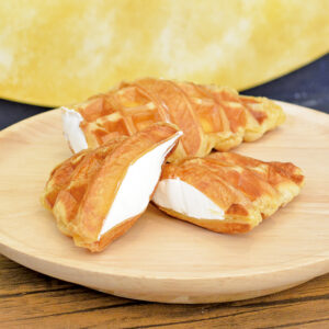 「くろっふるホイップ」は、ワッフル型で焼き上げたクロワッサンに甘さ控えめのホイップクリームをたっぷり入れました。カリカリのクロワッサン生地の食感が楽しい一品!ぜひお召し上がりください。