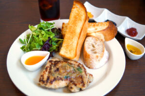 おすすめは、食パンとルヴァンのトースト ローストチキンプレミアムセット。赤城鶏をじっくり焼き上げたローストチキンと自慢のパン2種類をセットでどうぞ。ジャム各種も添えてありますので、お好みでトーストにつけてお召し上がりください。