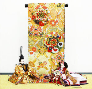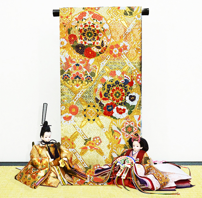 正絹の袋帯で製作した帯地雛。1本の帯から3セットずつの製作。佐賀錦や有栖川錦など各種。