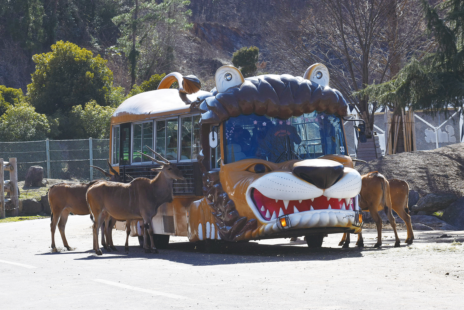 園内周遊には人気の「エサやり体験バス」に乗り、放し飼いの大型草食動物や、ライオンへバスの中から体験出来るエサやりは迫力満点。