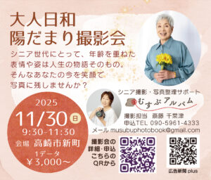 シニア世代にとって、年齢を重ねた表情や姿は、人生の物語そのもの。 だんだん「撮られる」機会が減ってしまうからこそ、意識して「今の自分」を笑顔で写真に残してほしい。 「大人日和 陽だまり撮影会」では、会話を楽しみながら、自然に溢れた笑顔をお撮りします。