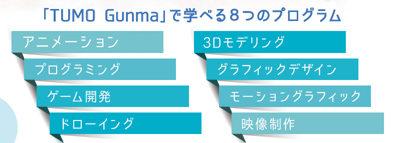 館内には自由にセルフラーニングができるメインエリアをはじめ、4つのワークショップルームや、榛名山を望めるパノラマエリアなどが設置されています。エンタメ業界はもちろん、IT・サービス、ものづくり、観光、農業、建設など、さまざまな分野で役に立つデジタルクリエイティブを楽しみながら習得することができます。