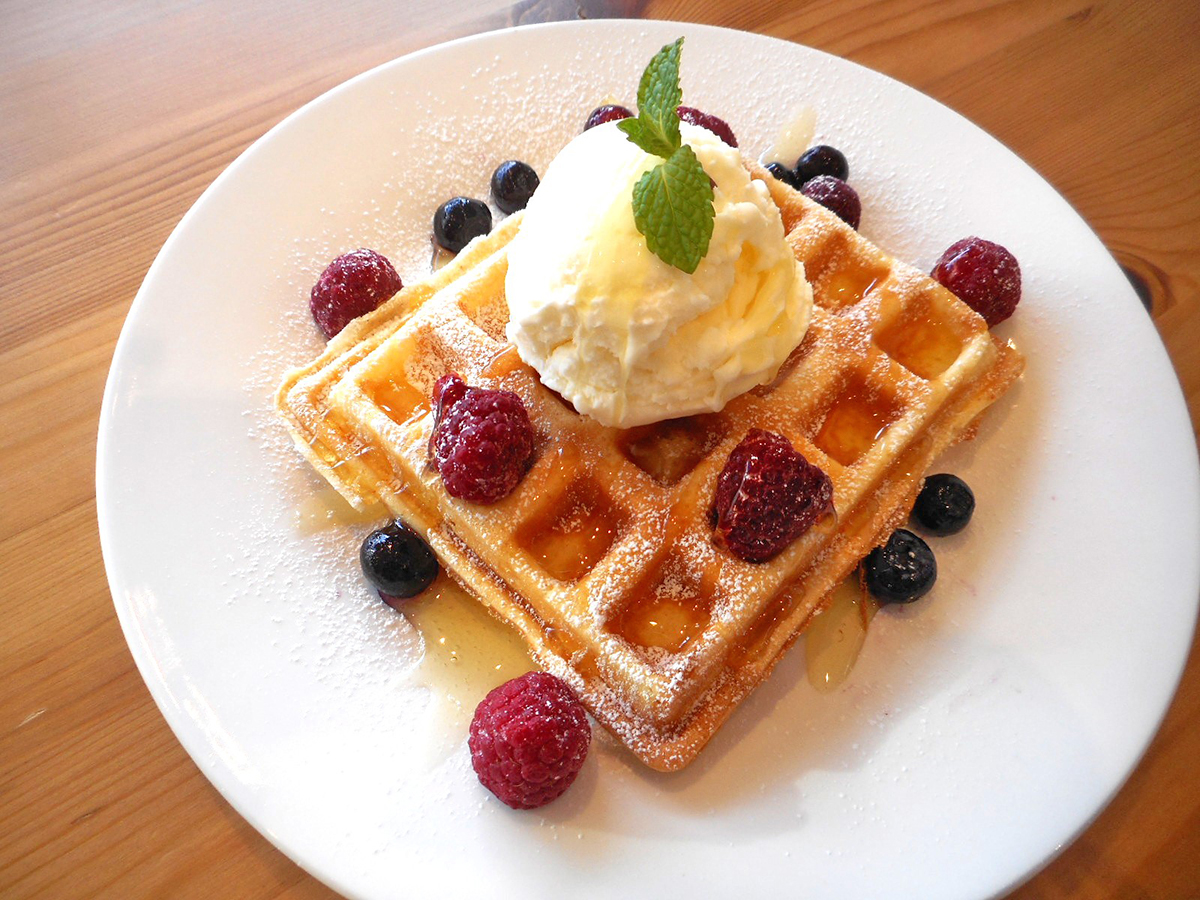 外はサクッ、中はふんわり焼き上げたワッフル、冷たいバニラアイスと甘酸っぱいベリーをたっぷり添えて。仕上げはとろ〜りメープルシロップ。ちょっとお腹が空いた時、友だちとのおしゃべりに「今日のごほうびスイーツ」はいかが。