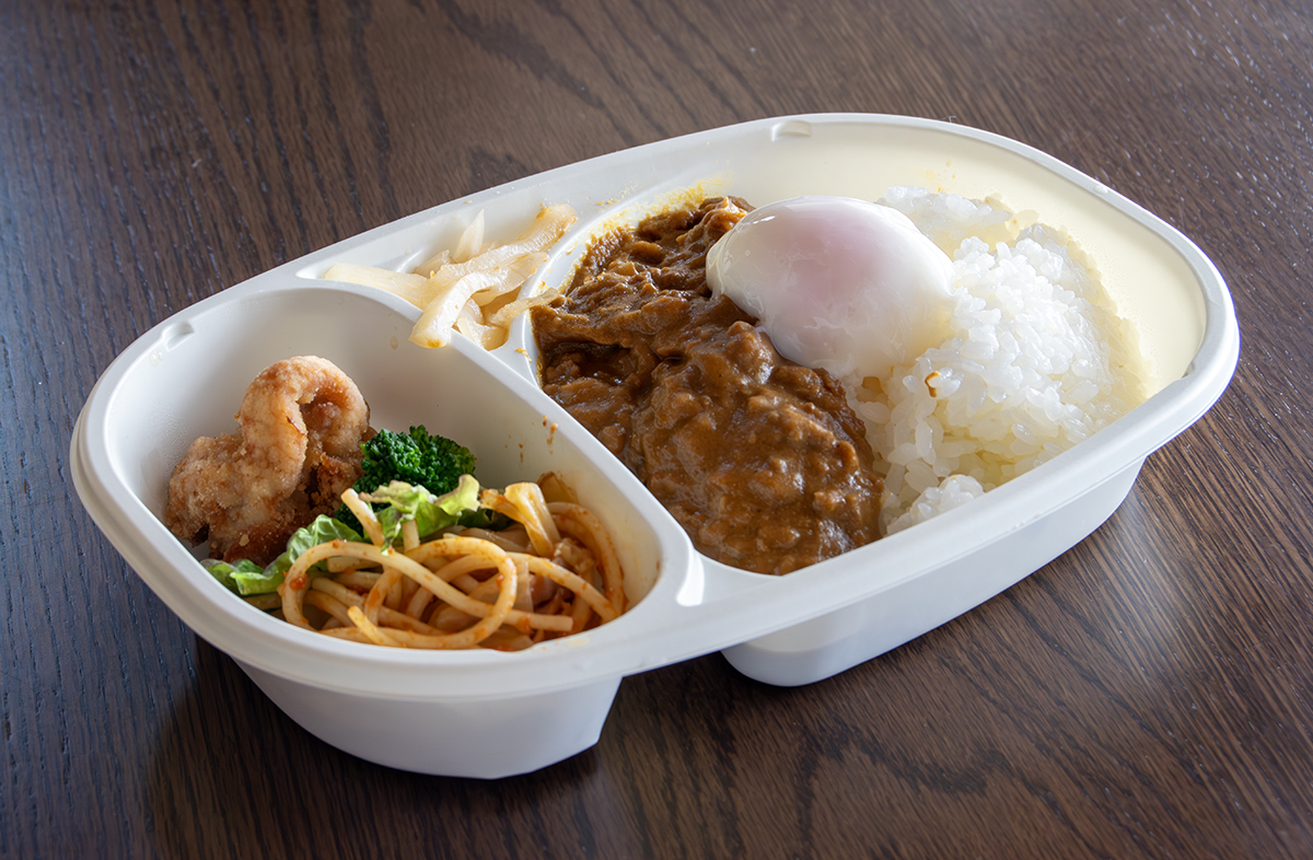 定番弁当は鶏もも肉の味噌煮弁当、ロールキャベツのお弁当、豚肉の赤ワイン煮込みのお弁当、カレー弁当 温泉卵付き、肉丼 温泉卵付き、他に日替わりで1〜2種類が揃います。